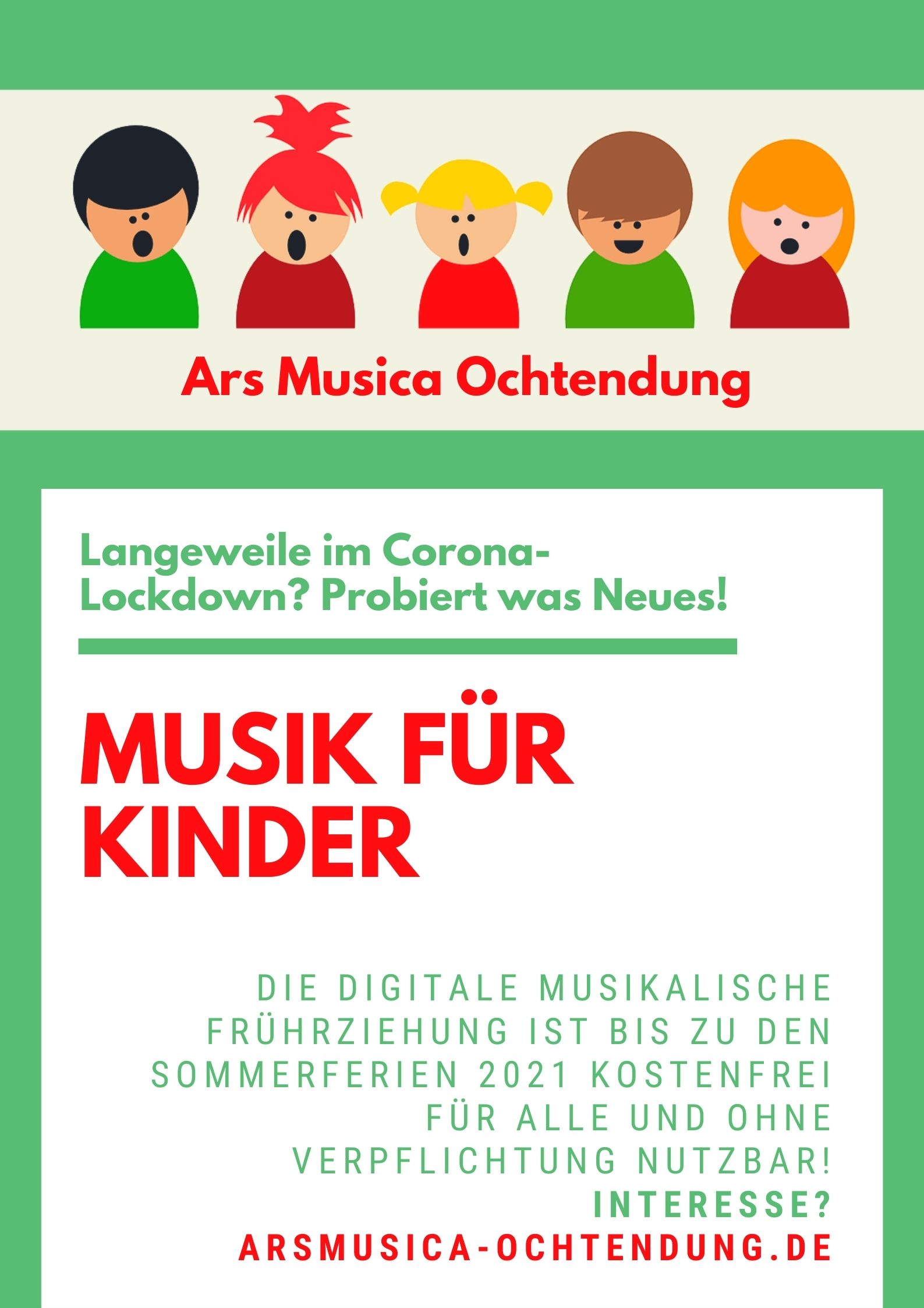 Ars Musica Ochtendung bietet ein vielfältiges Angebot für Kinder an, gemeinsam zu singen, zu musizieren und Spaß zu haben! Es gibt für die Kleinsten eine musikalische Früherziehung und für Schulkinder einen Kinderchor.
